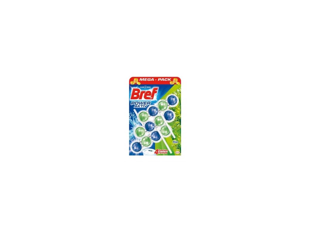 Tuhý WC blok Bref je vo forme 4 guľôčok s receptúrou so 4 funkciami - dokonalá čistota, čistiaca pena, ochrana proti vodnému kameňu a sviežosť. S atypickým tvarom, ktorý sa hodí pre všetky toalety. Certifikovaný ako odolný voči náhodnému otvoreniu deťmi (zdroj Nem. Inštitút pre Normalizáciu - norma DIN EN 862 2006). Vôňa borovice.Zloženie: