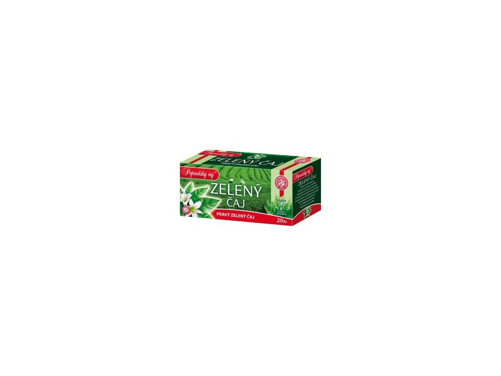 Pravý zelený čaj. Balenie 20 × 1,5 g. Vhodný doplnok pitného režimu.