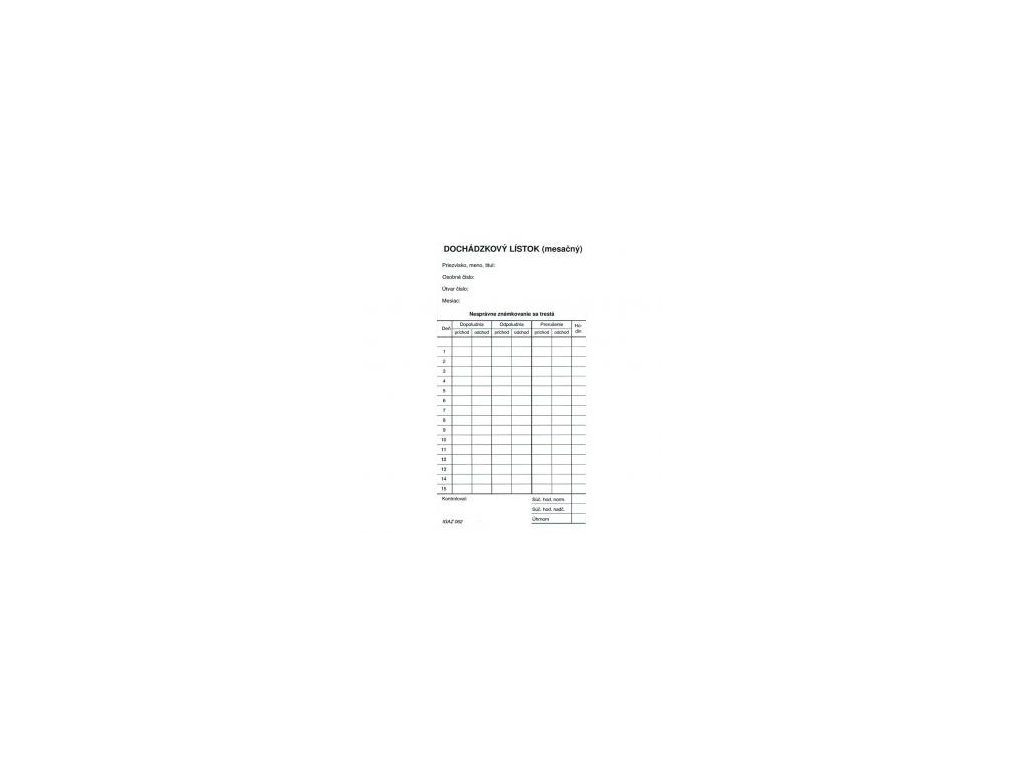 Tlačivo : Dochádzkový lístok mesačný (kartón).