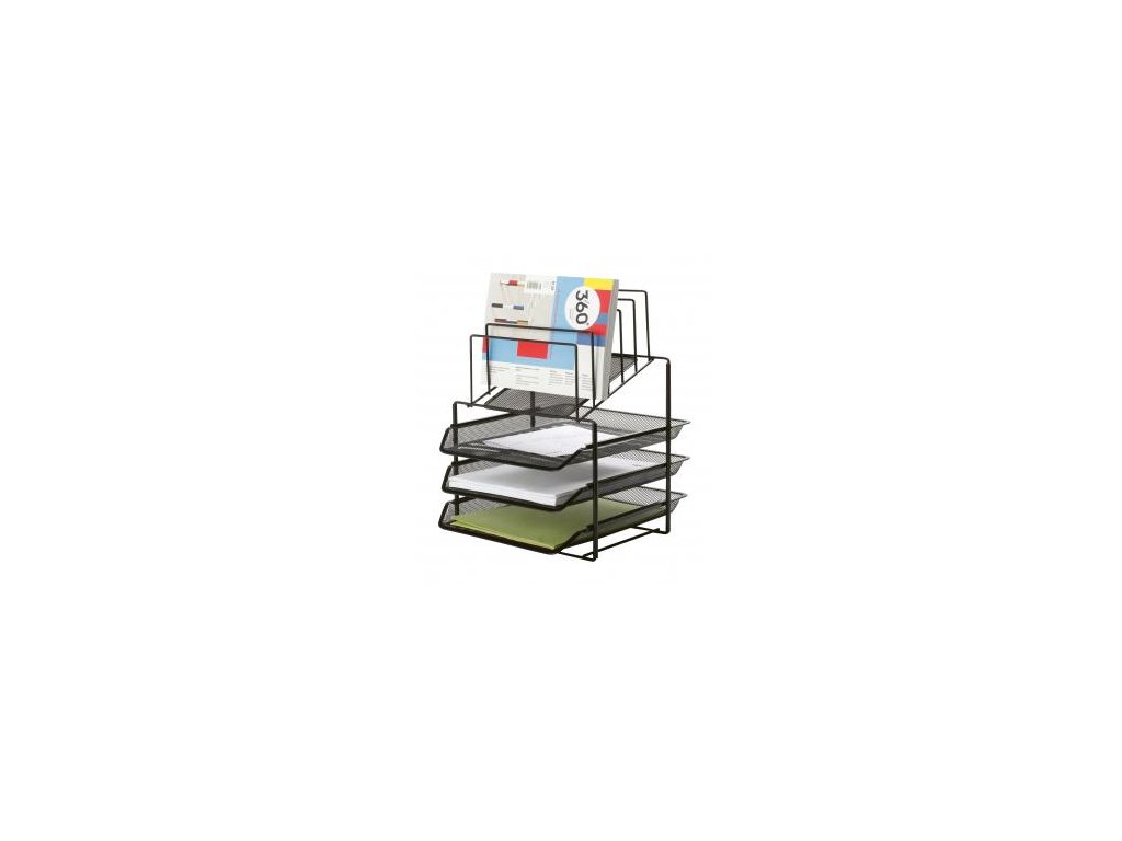 Stojan s tromi zásuvkami, vybavený dodatočným miestom pre katalógy, letáky alebo listy (5 priehradiek). Rozmery (š × v × h) 300 × 350 × 420 mm. Farba čierna.Dodatočné parametre