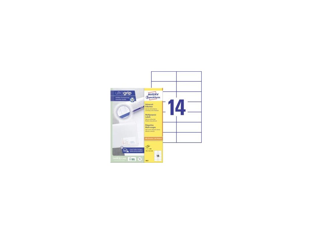 Biele univerzálne etikety vhodné na každodenné použitie v atramentových a laserových tlačiarňach a kopírovacích strojoch. Vďaka inovatívnej technológie ultragrip sa môžete spoľahnúť na bezchybné natiahnutie archu a tlač bez zasekávania. Bezpečnostný okraj QCT zabraňuje zanášaniu tlačiarne lepidlom. Pre laserové tlačiarne testované a certifi kované TÜV SÜD. Vysoká lepivosť na rôznych povrchoch. Ostrá tlač bez bez rozmazávania. Etikety sú vyrobené spôsobom šetrným k životnému prostrediu, majú certifi káciu FSC®, sú bielené bez použitia chlóru. Šablóny a softvér pre jednoduchú a rýchlu tlač etikiet k dispozícii zdarma. U niektorých rozmerov systém QuickPEEL™ na rýchlejšie odlepenie etikiet. Formát A4. Balenie 100 hárkov.Etikiet na hárku: 14