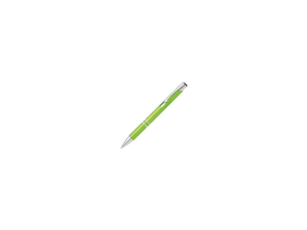 Plastové guľôčkové pero OIRA s kovovými doplnkami. Modrá náplň veľkoobjemová. Farba svetlozelená.Dodatočné parametre