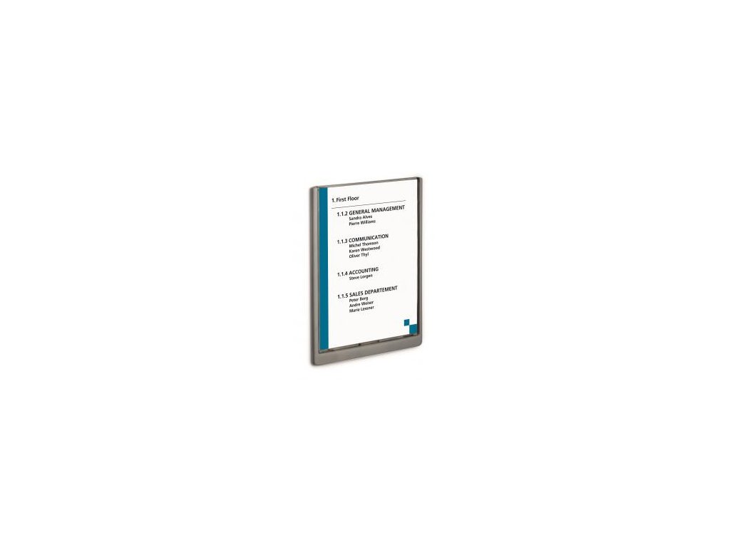 Moderná informačná tabuľka na dvere s lemom v atraktívnej grafitovej farbe. Predný panel sa otvára na jedno zatlačenie, a tým sa jednoducho sprístupnia vložené popisné papiere, ktoré sa môžu vymieňať podľa potrieb. Tabuľka je ideálna do kancelárií, úradov, škôl, univerzít a hotelov. Súčasťou balenia je montážna sada s názorným návodom. Namiesto pevného montovania môže byť tabuľka k povrchu aj prilepená.Rozmery: 210 x 297 mm