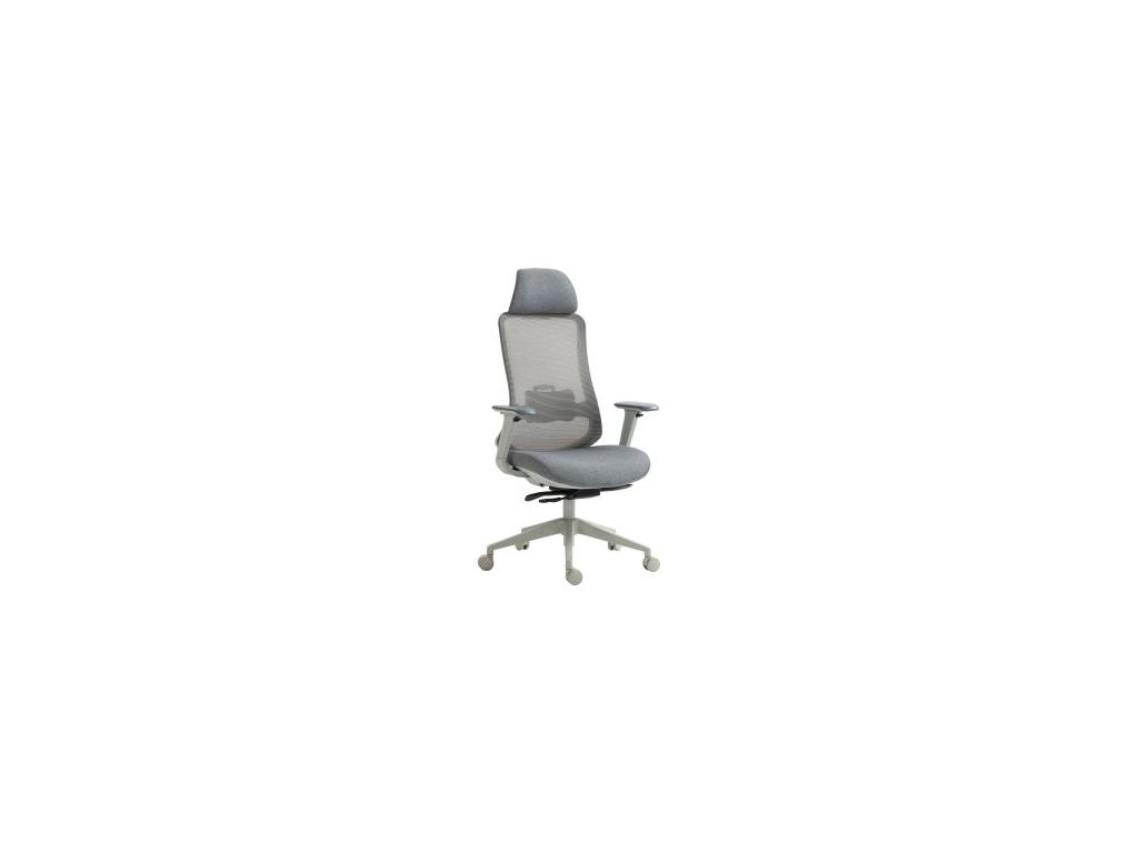 • ergonomická otočná kancelárska stolička s vysokým sieťovaným operadlom, látkovým čalúneným sedákom, opierkou hlavy a podrúčkami