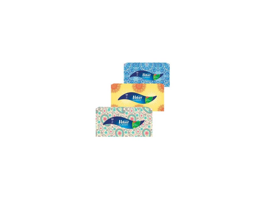 Jemné vreckovky Velvet Classic sú osvedčeným pomocníkom v akejkoľvek situácii. Osvedčia sa pri líčení či odličovaní, rovnako ako pri častom utieraní nosa. Krabičky s prírodným dizajnom sa stanú decentnou dekoráciou akéhokoľvek interiéru. 2vrstvové, 150 ks, 100% celulózaDodatočné parametre