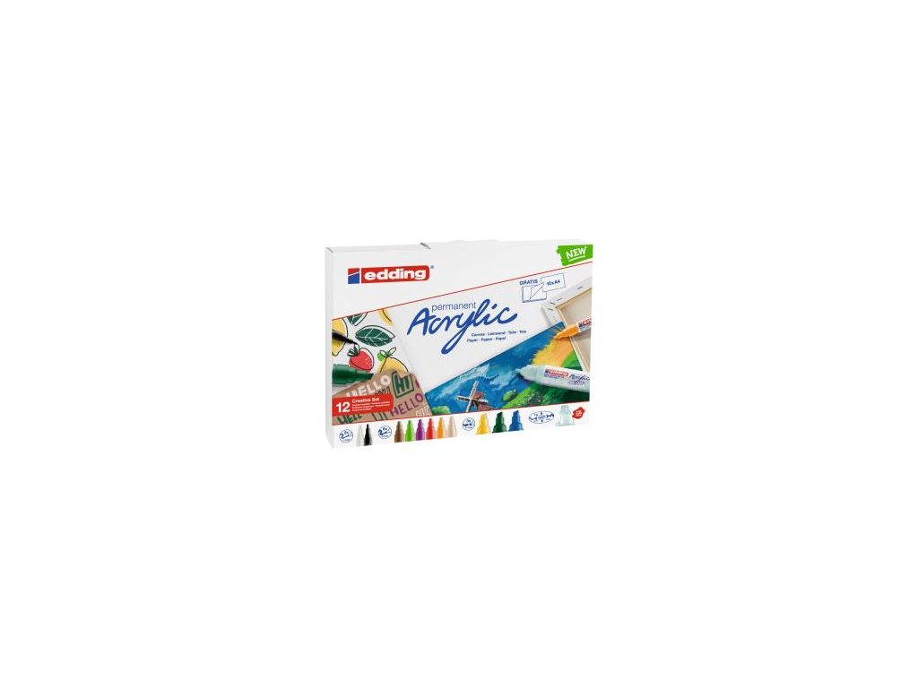 Akrylový popisovač na maľovanie na svetlé alebo tmavé povrchy, ideálny na materiály ako plátno alebo maliarsky papier. Súprava obsahuje 2 akrylové popisovače s tenkým hrotom edding 5300, 6 akrylových popisovačov so stredne širokým hrotom edding 5100, 3 akrylové popisovače so širokým hrotom edding 5000 a 1 obojstrannú akrylovú tubu edding 5400 3D. edding 5300 akrylový popisovač s tenkým hrotom: 1x čierna, dopravná biela. edding 5100 akrylový popisovač so stredne širokým hrotom: 1x žltozelená, slnečnožltá, dopravná červená , purpurová, béžová a lieskooriešková. edding 5000 akrylový popisovač so širokým hrotom: 1x machovozelená, enciánovomodrá a dopravná žltá. edding 5400 3D obojstranná akrylová tuba: 1x pastelovomodrá. Vysoko kvalitná pigmentovaná akrylová farba na báze vody je po zaschnutí permanentná, nepriehľadná, svetlostála a bez zápachu. Farby čierna, dopravná červená, enciánovomodrá, purpurová, lieskooriešková, žltozelená a machovo zelená sú vysoko krycie.