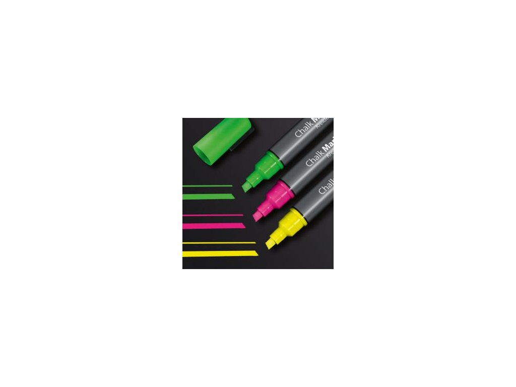 Ľahko stierateľné a vysoko nepriehľadné kriedové popisovače vhodné na sklenené tabule a všetky hladké povrchy podobné sklu. Zrezaný hrot hrúbky 1 - 5 mm. Vodeodolný atrament je zmazateľný vlhkou alebo suchou utierkou. Farba mix, žltá, ružová, zelená.Dodatočné parametre