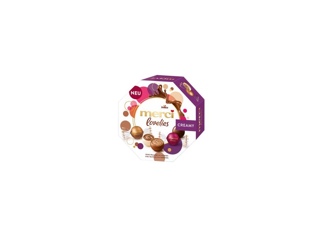 Okrúhly pôžitok s krémovým jadrom. Lahodné Merci Lovelies Creamy zvádzajú nielen svojou jemnou náplňou, ale aj plnou chuťou. Chrumkavá škrupina z troch rôznych druhov čokolády obklopuje jemné jadro so sladkou krémovou náplňou, ktorá sa lahodne rozpúšťa v ústach. Skutočné potešenie z krásnych okamihov v živote. Darčeková krabička so 14 jednotlivo balenými čokoládami v 4 príchutiach. Balenie meria cca 15 x 15 x 5cm a obsahuje tieto druhy: mliečna pralinka, nugát, horká pralinka, cappuccino krém.Zloženie: cukor, kakaové maslo, kakaová hmota, sušené plnotučné mlieko, rastlinný kokosový tuk, mleté jadrá lieskových orechov 3,7 %,