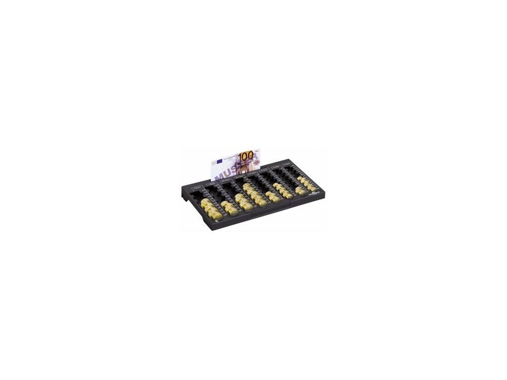 Samostatná mincová priehradka z tvrdého plastu, rozmerovo vhodná do bežnej stolovej zásuvky. Osem oddielov na eurá a centy v maximálnej hodnote 233,90 Euro, priehradka na bankovky, poukážky alebo stravné lístky vo vrchnej časti.Rozmery: 324 x 34 x 190 mm