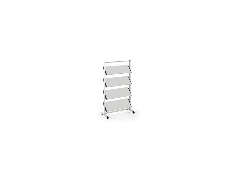 Vysoko kvalitný elegantný a pevný mobilný prezentačný stojan na časopisy alebo katalógy formátu A4. Stojan je dodávaný v rozloženom tvare. Materiál kov. Farba svetlosivá/-čierna. Štyri police s možnosťou fixácie v 3 sklonoch na max. 12×A4 formátov.Rozmery (š×v×h) 940×1760×425 mm.