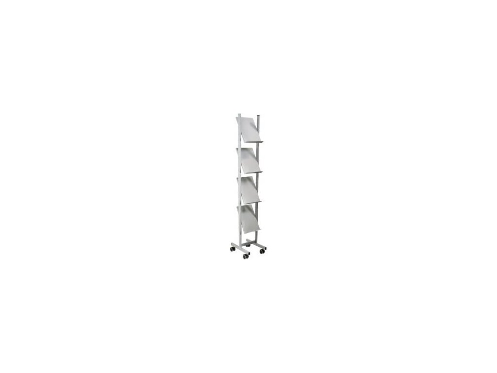 Vysoko kvalitný elegantný a pevný mobilný prezentačný stojan na časopisy alebo katalógy formátu A4. Stojan je dodávaný v rozloženom tvare. Materiál kov. Farba svetlosivá. Štyri police na 4 × A4 formáty. Rozmery (š × v × h) 260 × 1 580 × 390 mm.Dodatočné parametre