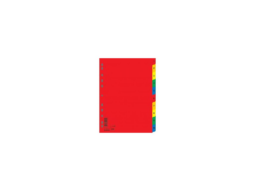 Rozraďovač formátu A4 vyrobený z tuhého polypropylénu. Jednotlivé stránky v rôznych farbách, multiperforácia na použitie rozraďovača v krúžkovom aj pákovom zakladači. Väčšie balenie 25 sád.Rozmery 230x297mm