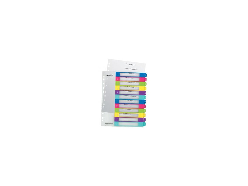 Opakovane použiteľný a extra odolný plastový číselný rozraďovač 1 - 12 v žiarivých farebných kombináciách s univerzálnou perforáciou. Materiál odolný polypropylén hrúbky 0,3 mm. Formát A4 maxi. Možnosť potlače na upravenie podľa vlastných potrieb, predloha stiahnuteľná zdarma na www.esselte.com/ easyprint.Dodatočné parametre