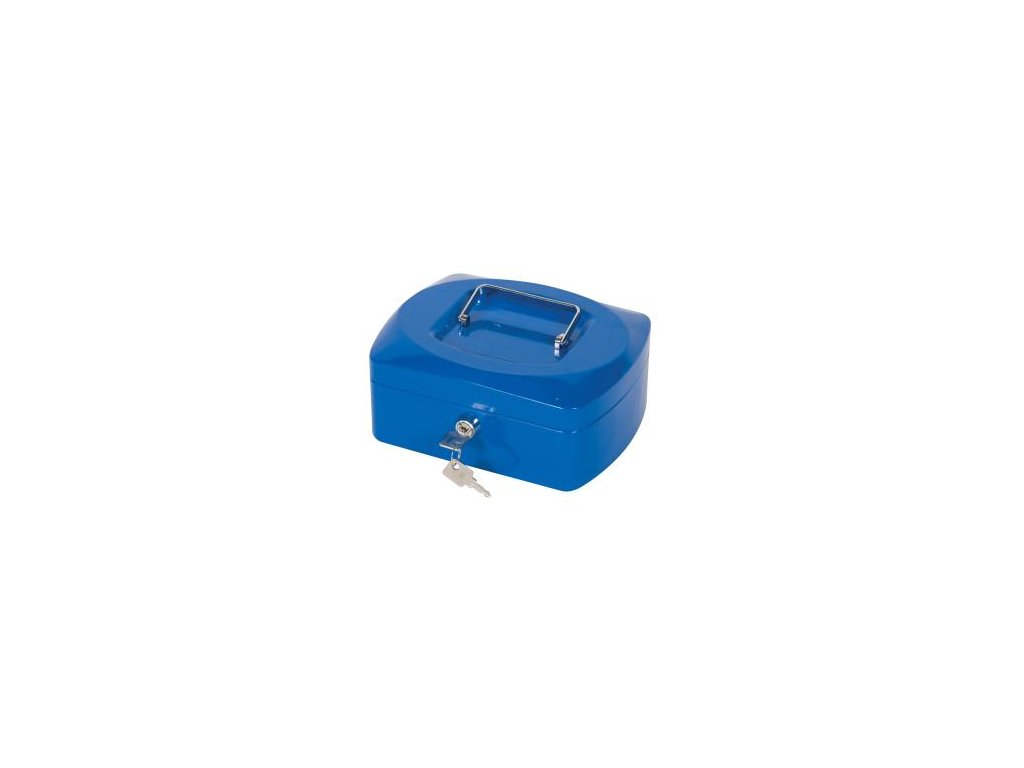 Uzamykateľná pokladnička s tvarovaným úchytom, plastovou priehradkou na mince a 2 kľúčami. Materiál pevná oceľ. Rozmery 205 × 85 × 160 mm. Farba modrá.Dodatočné parametre