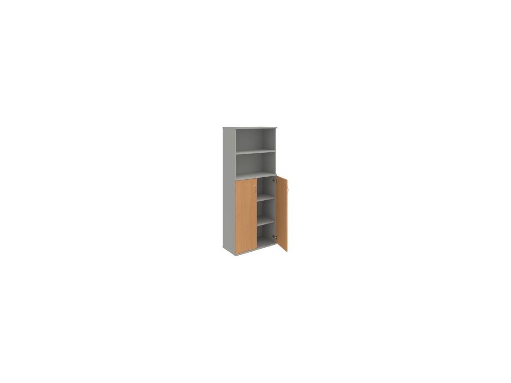 Kombinovaná skriňa - dvere/nika. Kancelárske skrine STRONG majú robustnú konštrukciu a vyššiu nosnosť políc ako bežné kancelárske skrine.V ponuke sú skriňové moduly s výškou 185 cm, 111 cm alebo 74 cm a šírky 80 cm alebo 40 cm.Hĺbka všetkých modelov skriňového radu STRONG je 40 cm.Chrbát, vyrobený z 8 mm hrubých dosák, je obojstranne pohľadový, takže skrine môžete použiť ako priestorový deliaci prvok. Hrúbka samotných políc je 25 mm, čo znamená nosnosť 80 kg na 1 policu.Korpusy, dvierka a police skríň sú olepené odolnou 2mm ABS hranou, ktorá garantuje dostatočnú ochranu proti poškodeniu.