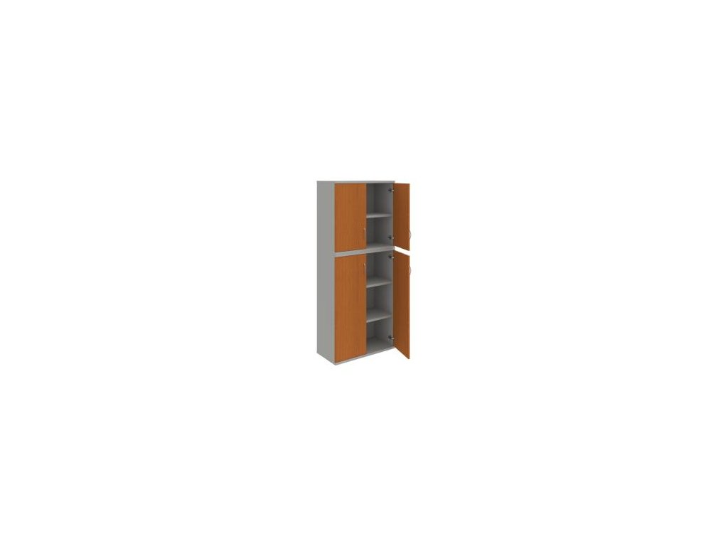 Kombinovaná skriňa - dvere/nika. Kancelárske skrine STRONG majú robustnú konštrukciu a vyššiu nosnosť políc ako bežné kancelárske skrine.V ponuke sú skriňové moduly s výškou 185 cm, 111 cm alebo 74 cm a šírky 80 cm alebo 40 cm. Hĺbka všetkých modelov skriňového radu STRONG je 40 cm.Chrbát, vyrobený z 8 mm hrubých dosák, je obojstranne pohľadový, takže skrine môžete použiť ako priestorový deliaci prvok. Hrúbka samotných políc je 25 mm, čo znamená nosnosť 80 kg na 1 policu.Korpusy, dvierka a police skríň sú olepené odolnou 2mm ABS hranou, ktorá garantuje dostatočnú ochranu proti poškodeniu.