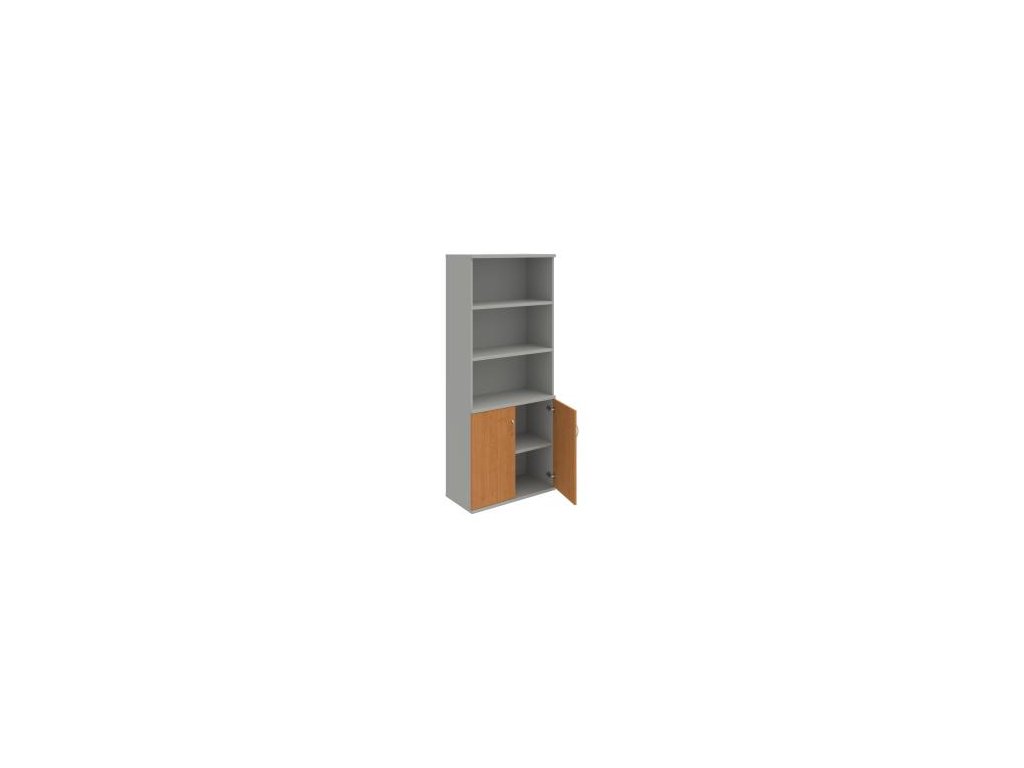 Kombinovaná skriňa - dvere/nika. Kancelárske skrine STRONG majú robustnú konštrukciu a vyššiu nosnosť políc ako bežné kancelárske skrine.V ponuke sú skriňové moduly s výškou 185 cm, 111 cm alebo 74 cm a šírky 80 cm alebo 40 cm.Hĺbka všetkých modelov skriňového radu STRONG je 40 cm.Chrbát, vyrobený z 8 mm hrubých dosák, je obojstranne pohľadový, takže skrine môžete použiť ako priestorový deliaci prvok. Hrúbka samotných políc je 25 mm, čo znamená nosnosť 80 kg na 1 policu.Korpusy, dvierka a police skríň sú olepené odolnou 2mm ABS hranou, ktorá garantuje dostatočnú ochranu proti poškodeniu.