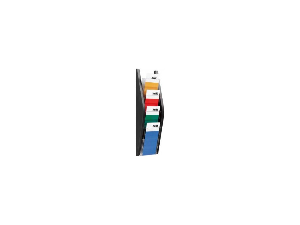 Nástenný stojan na prezentáciu materiálov. Štyri priehľadné priehradky slúžia na umiestnenie materiálov formátu 1/3 A4. Materiál kvalitný plast. Rozmery (š x v x h) 165 x 540 x 80 mm. Farba čierna.Dodatočné parametre