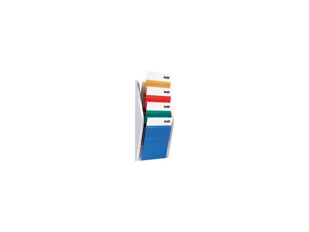 Nástenný stojan na prezentáciu materiálov. Štyri priehľadné priehradky slúžia na umiestnenie materiálov formátu A4. Materiál kvalitný plast. Rozmery (š x v x h) 275 x 540 x 80 mm. Farba strieborná.Dodatočné parametre