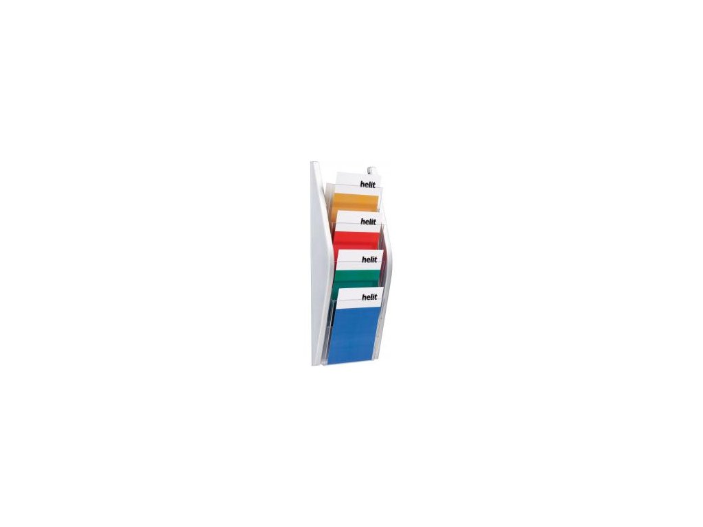 Nástenný stojan na prezentáciu materiálov. Štyri priehľadné priehradky slúžia na umiestnenie materiálov formátu A5. Materiál kvalitný plast. Rozmery (š x v x h) 215 x 540 x 80 mm. Farba strieborná.Dodatočné parametre