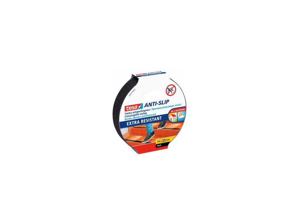 Protišmyková páska tesa® je účinným prostriedkom na prevenciu pádov na kritických miestach, ako sú schodové rohožky, rampy, klzké podlahy alebo paluby. Táto páska nielenže zaisťuje veľmi silnú priľnavosť, je tiež odolná voči UV žiareniu a vode, extrémnym teplotám a čistiacim prostriedkom. Bezpečne sa prilepí k akémukoľvek klzkému povrchu zbavenému nečistôt, oleja a mastnoty. Rozmery 25 mm × 5 m. Farba čierna.Dodatočné parametre