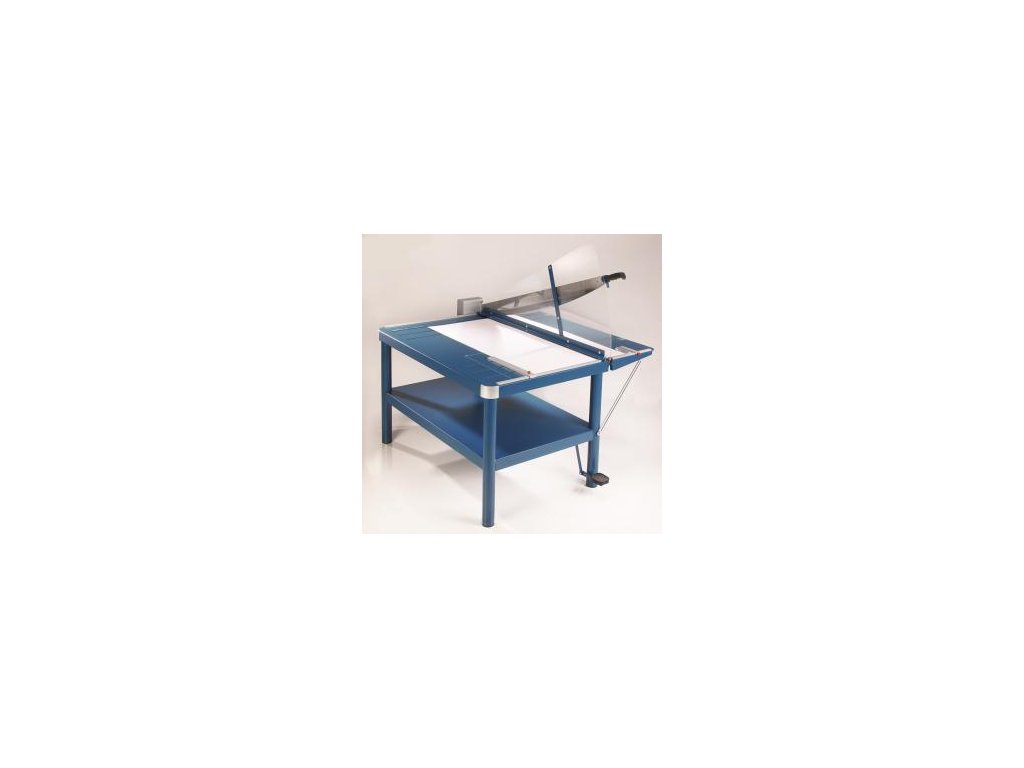 Veľká kovová robustná páková rezačka s vlastným stojanom a uzamykateľným nožom. Brúsený vrchný a spodný nôž z kvalitnej nožiarskej ocele Solingen, rozkladateľný bočný stôl, nožný pedál na zabezpečenie prítlaku rezaného papiera, priehľadný ochranný kryt ostria z plexiskla, 2 bočné dorazy, zadný doraz. Predný doraz, fixovateľný ručnou pákou, vysúvateľný do 275 mm. Mierka v cm/ inch, DIN formáty.K rezačke je možné objednať zariadenie na rezanie tenkých prúžkov a zariadenie umožňujúce vytvoriť laserový lúč, indikujúci reznú líniu.Dĺžka rezu: 1100 mm