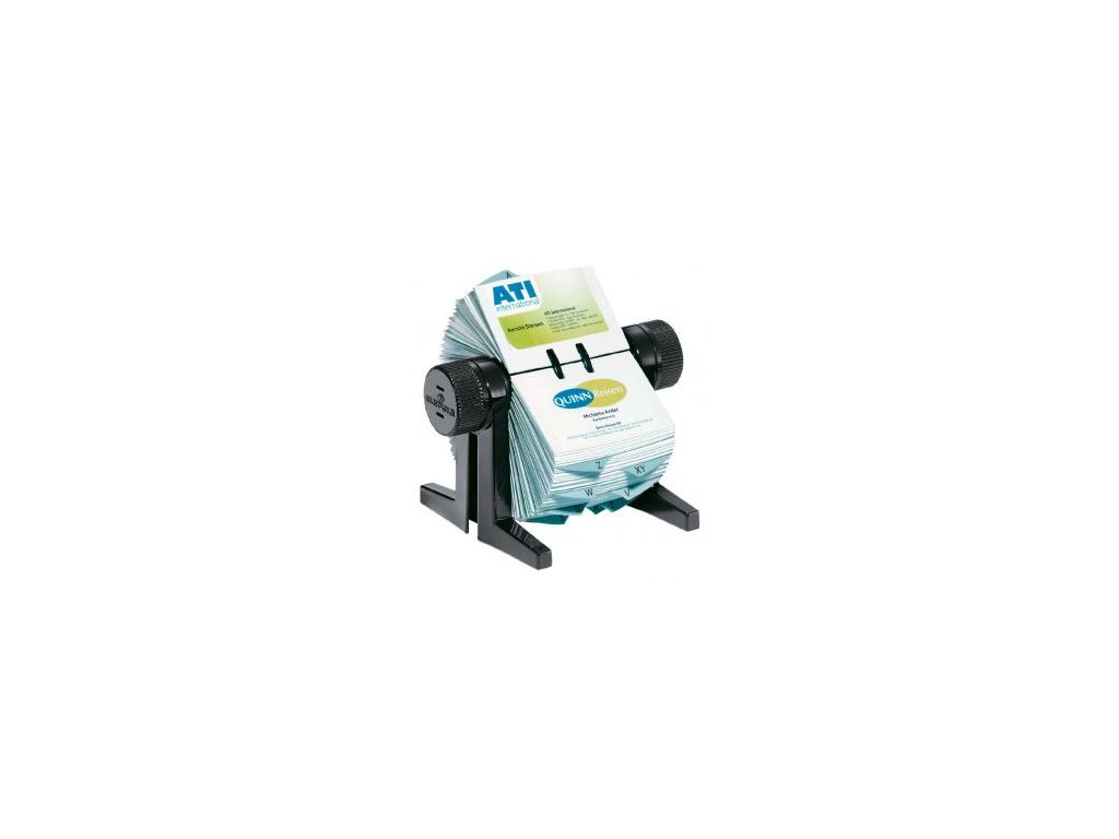 Praktický rotačný vizitkár s rozraďovačom. Vyrobený z kvalitného plastu. Obsahuje 150 obojstranných vreciek rozmeru 72 × 104 mm a abecedný rozraďovač s 25 oddielmi. Kapacita 300 vizitiek. Vrecká na vizitky sa ľahko vyberajú a umožňujú tak rýchle narábanie s vizitkami.Farba: čierna