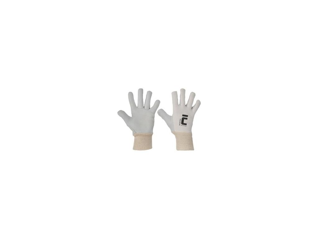 Rukavice šité z jemnej lícovej ovčiny v dlani, bielej bavlnenej tkaniny na chrbte a s nápletom.Materiál:
