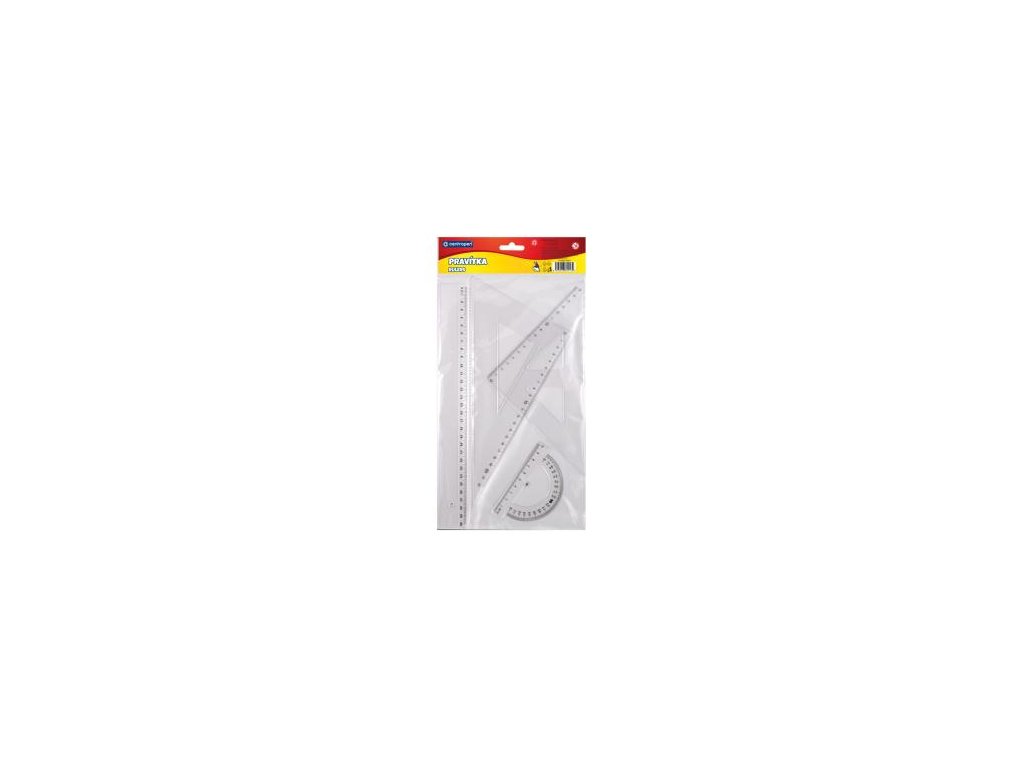Rysovacia súprava trojuholník s ryskou 45°/177, trojuholník 60°/250, uhlomer 180°/100 s ryskou a pravítko 30 cm, číry plast.