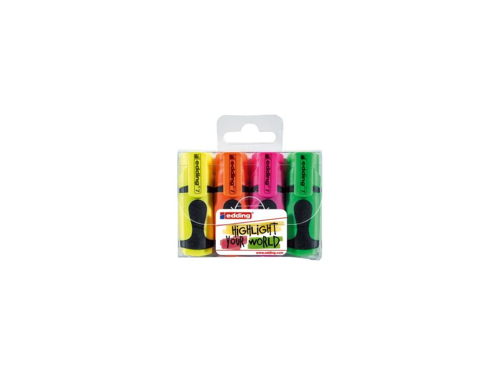 4 kusová sada mini zvýrazňovačov edding so zrezaným hrotom so šírkou stopy 1 - 3 mm. Neónový pigment s maximálnym jasom, protišmyková ergonomická rukoväť. Uzáver s klipom. Väčšie balenie 10 ks v jednej farbe. Balenie sada 4 kusov.Dodatočné parametre