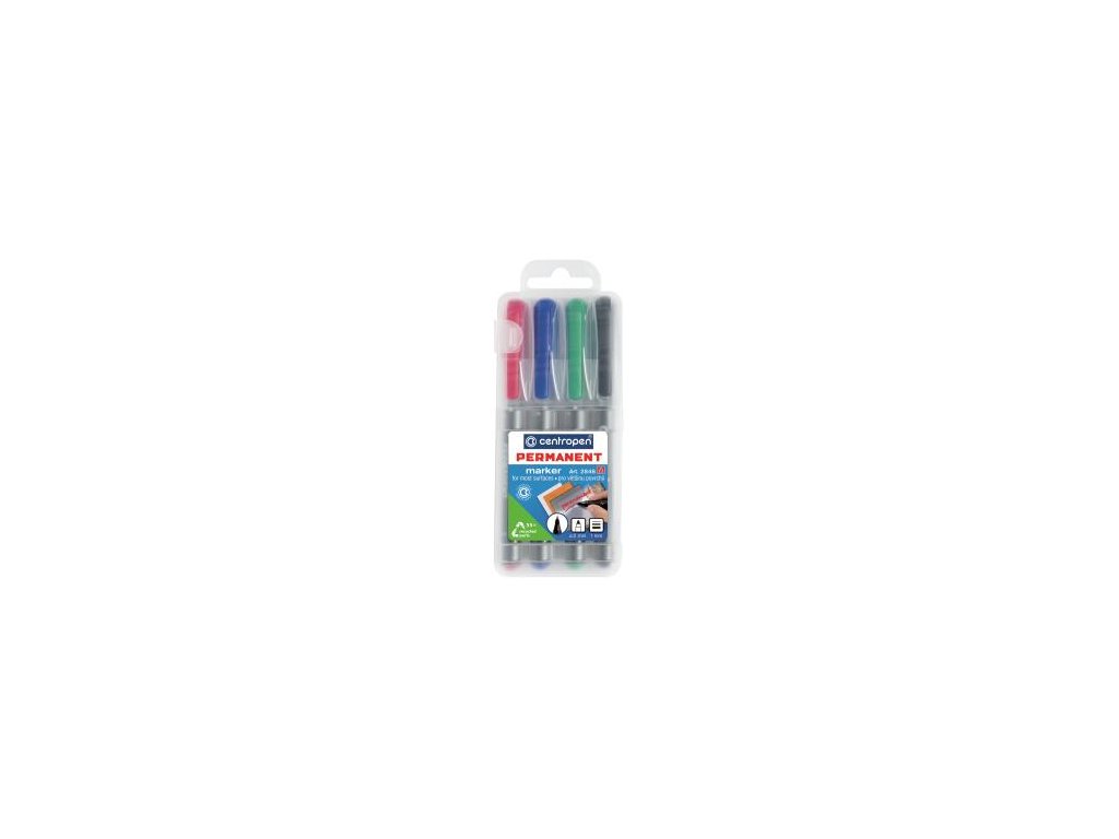 Sada 4 ks permanentných popisovačov s atramentom na alkoholovej báze a vláknovým hrotom. Popisovače vhodné na plastické hmoty, sklo, filmy a pod. Šírka stopy 1 mm.Farba: sada 4 ks