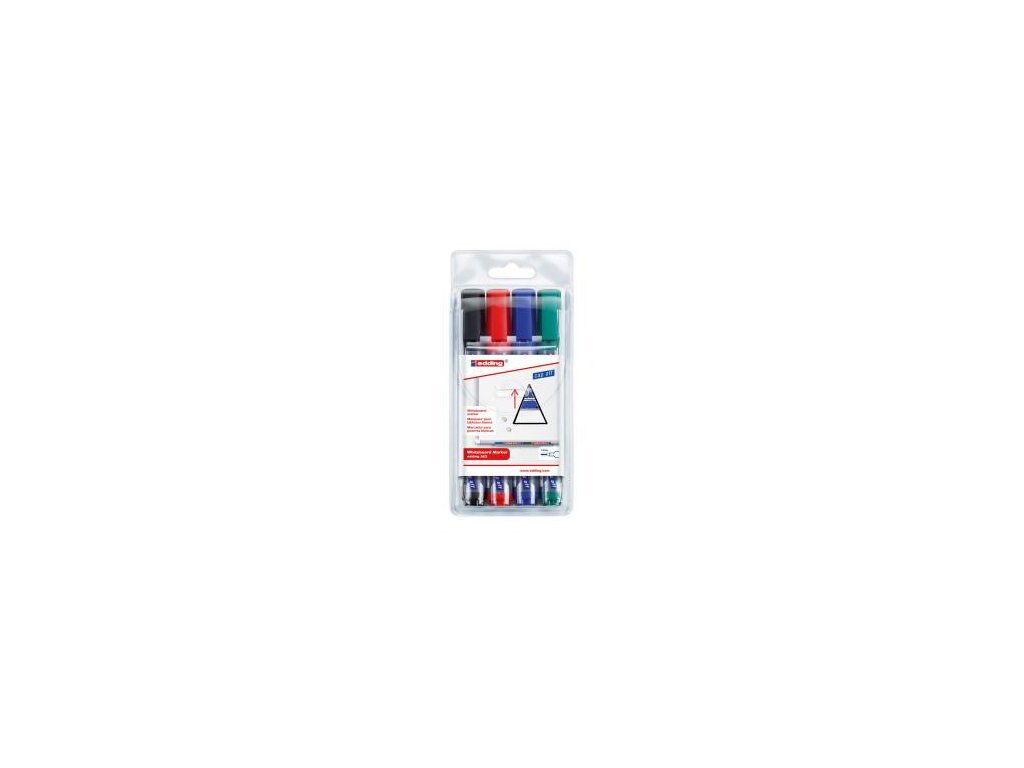 Popisovač na biele tabule s plastovým telom a vymeniteľným hrotom. Dopĺňateľný atramentom edding BTK 25. Hrot zrezaný, šírka stopy 1---5 mm. Sada 4 ks.Farba: sada 4 farieb