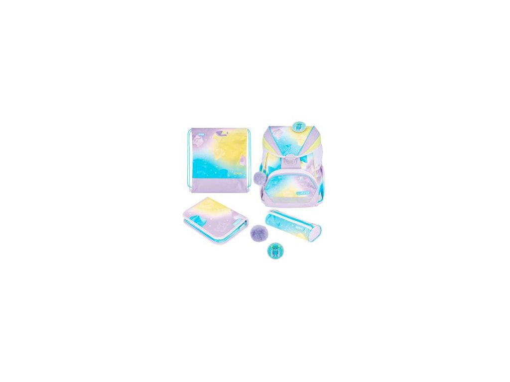 Školská taška s výbavou, s anatomicky tvarovaným polstrovaným a priedušným chrbtom, nastaviteľnými ramennými popruhmi, predným vreckom na zips, dvomi bočnými vreckami s elastickými pásikmi, stabilnou spodná doskou s nožičkami, pohodlnou rukoväťou, reflexnými prvkami Oralite, zatváranie Click lock zips, 1 x odnímateľný odznačik na suchý zips, 1 x dekoratívny prvok. Hmotnosť 800 g, objem 22 l, rozmery: 39 x 32 x 25 cm. Vode-odolná, bez PVC, výbava: peračník prázdny 2 chlopne, vrecko na prezuvky, oválne puzdro.Dodatočné parametre
