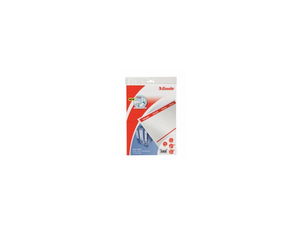 Náhradné samolepiace papierové chrbtové štítky na páíkové kartónové zakladače Rainbow a Mramor, šírky chrbta 7,5 cm na identifikáciu založených dokumentov. Štítky sú vhodné na potlač do laserových a atramentových tlačiarní a kopíriek cez jednoduchý internetový nástroj `EASYPRINT` na stránke www.esselte.com/easyprint. V balení 10 hárkov (á 4 štítky/hárok) s predperforovanými štítkami rozmeru 59 x 192 mm. Hmotnosť papieru 80 g/m2. Farba biela.
