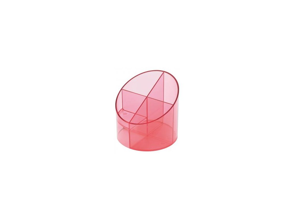 Stojan so štyrmi oddielmi na perá, ceruzky a kancelárske drobnosti z plastu v ekonomickom prevedení. Výška 105 mm, priemer 110 mm. Farba priehľadná červená.Dodatočné parametre