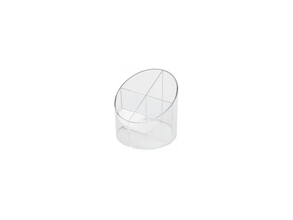Stojan so štyrmi oddielmi na perá, ceruzky a kancelárske drobnosti z plastu v ekonomickom prevedení. Výška 105 mm, priemer 110 mm. Farba priehľadná číra.Dodatočné parametre