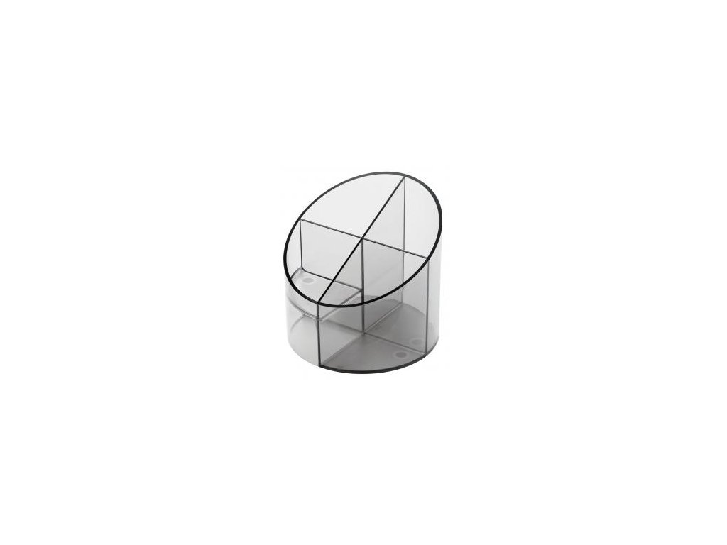 Stojan so štyrmi oddielmi na perá, ceruzky a kancelárske drobnosti z plastu v ekonomickom prevedení. Výška 105 mm, priemer 110 mm. Farba priehľadná dymová.Dodatočné parametre