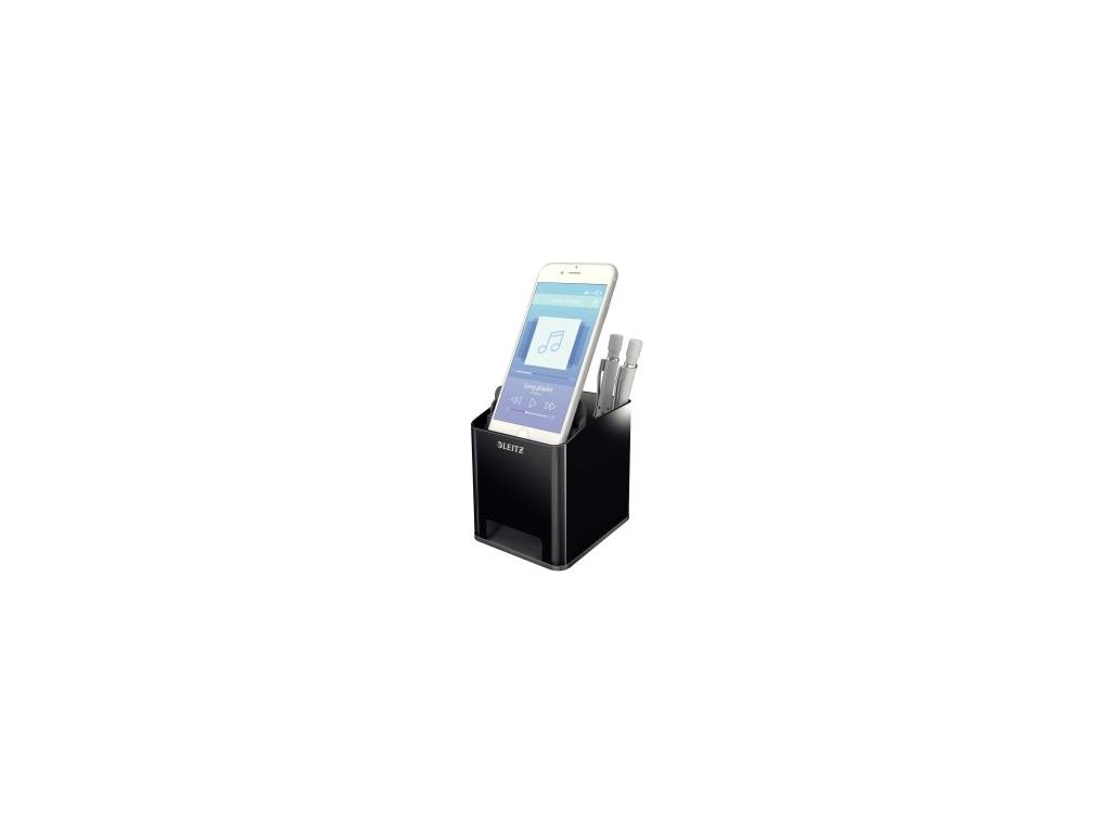 Neprehliadnuteľný štýlový stojan na perá v prémiovej kvalite Leitz v štýlových žiarivých farbách WOW. Extra odkladač pre smartphone do veľkosti iPhone 6 plus so špeciálnou funkciou pre zosilovanie zvuku, veľa miesta pre písacie potreby, pravítko, stylus a iné drobnosti. Moderný dizajn, ktorý vyzerá rovnako dobre v kancelárii, ako aj doma na pracovnom stole, dobre dopĺňa ostatné produkty radu WOW. Farba čierna.Dodatočné parametre