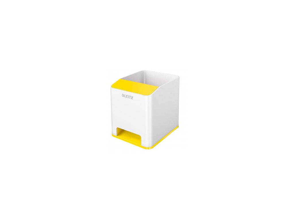 Neprehliadnuteľný štýlový stojan na perá v prémiovej kvalite Leitz v štýlových žiarivých farbách WOW. Extra odkladač pre smartphone do veľkosti iPhone 6 plus so špeciálnou funkciou pre zosilovanie zvuku, veľa miesta pre písacie potreby, pravítko, stylus a iné drobnosti. Moderný dizajn, ktorý vyzerá rovnako dobre v kancelárii, ako aj doma na pracovnom stole, dobre dopĺňa ostatné produkty radu WOW. Farba žltá.Dodatočné parametre