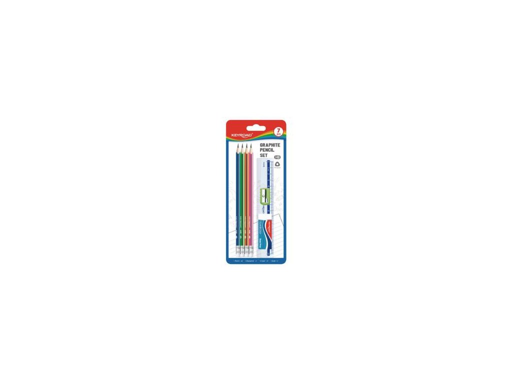 Súprava školských pomôcok KEYROAD, 7 ks: drevená ceruzka HB trojuholníková, s gumou 4 ks, plastové strúhadlo 1 ks, guma 1 ks, plastové pravítko priehľadné, 15 cm 1 ks. Balenie: blister. Farba: mix farieb.Dodatočné parametre