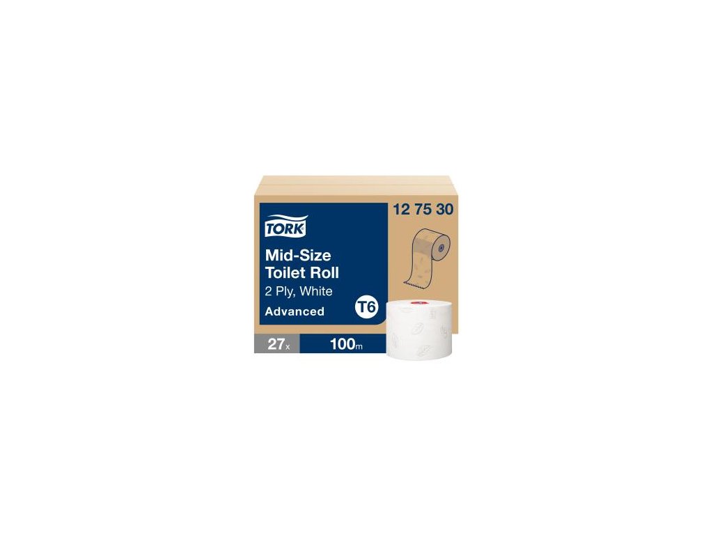 Dvojvrstvový biely toaletný papier z celulózy do zásobníkov Tork Mid-size, balený v kartóne po 27 ks. Dĺžka kotúča 100 m, priemer kotúča 13,2 cm.Dodatočné parametre