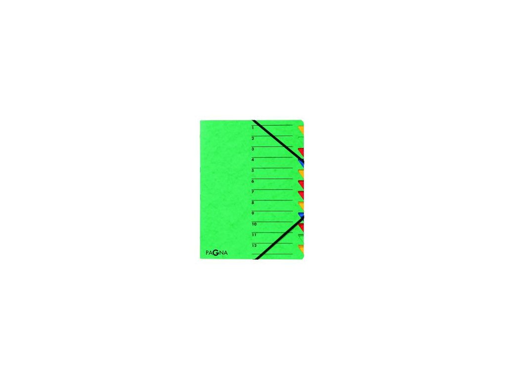 Triediaca zložka s 12 oddielmi, farebnými kartónovými listami a indexom, uzatvárateľná gumičkou. Možnosť popisu obsahu na titulnej strane.Farba vrchného obalu: zelená