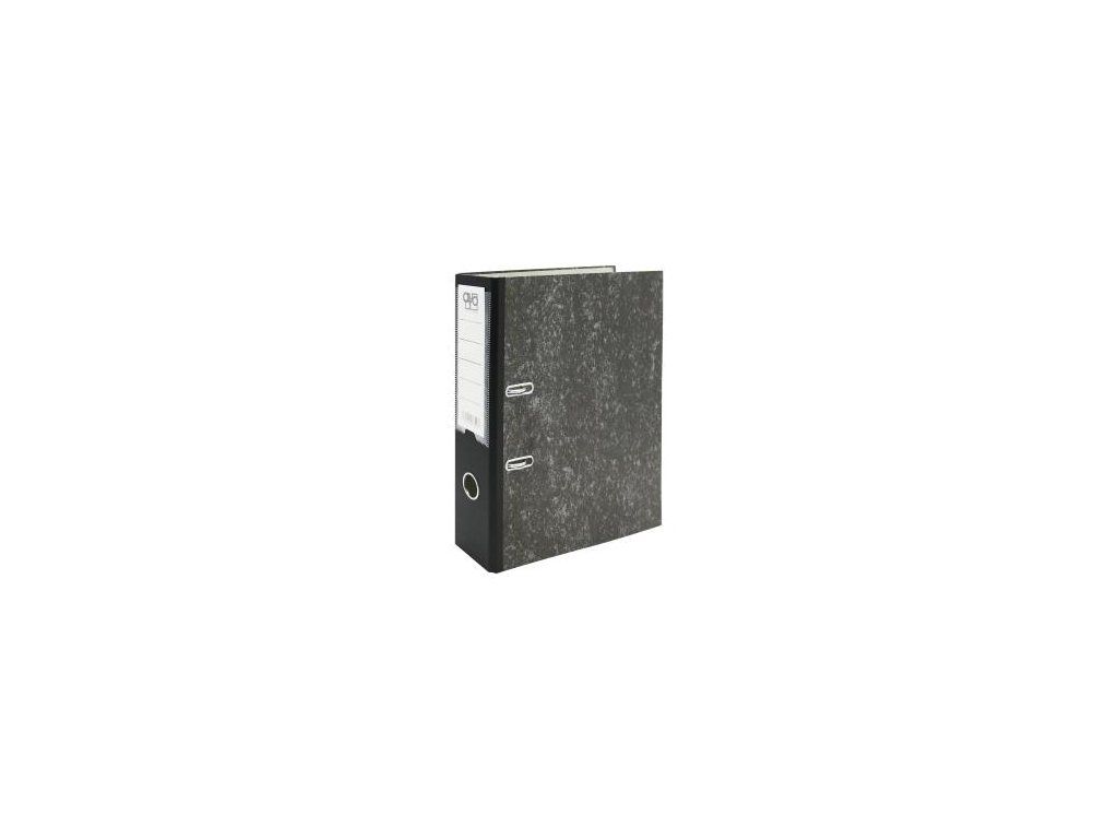 Kartónový pákový zakladač - poťah čierny mramor.Chrbtový otvor pre lepšiu manipuláciu, chrbát 7,5 cm polepený čiernou plastovou fóliou na spevnenie, plastové chrbtové vrecko na výmenu štítku.